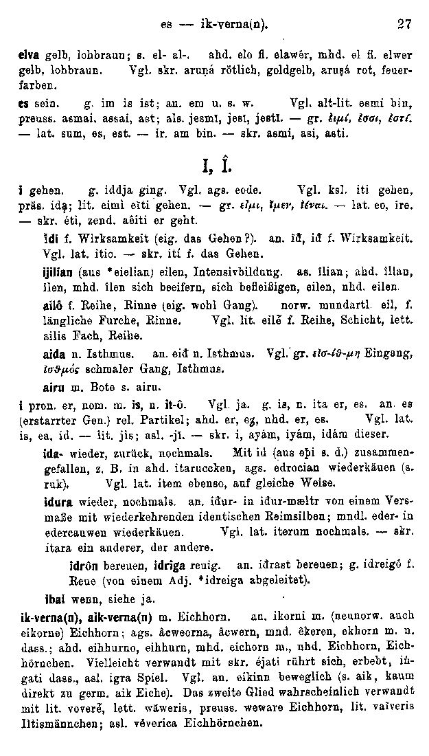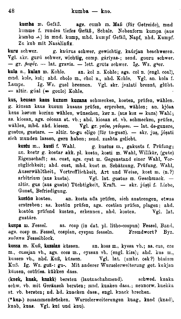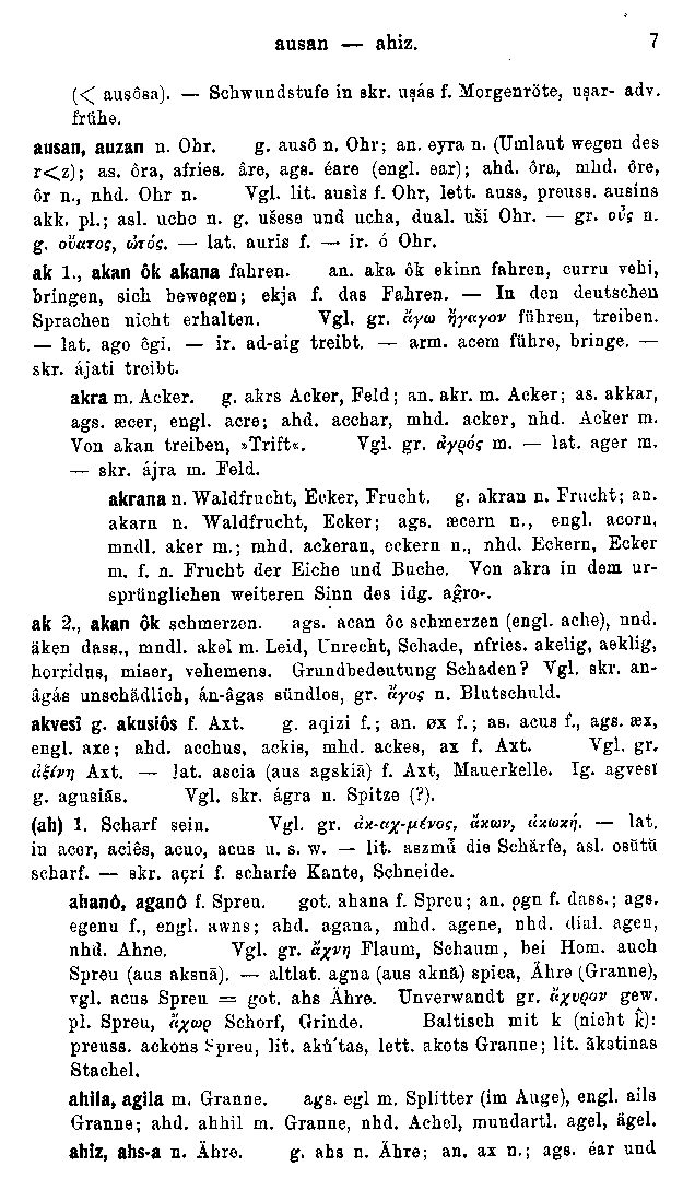 The entries are listed in Sanskrit alphabetical order, adapted for the Proto-Germanic segmental inventory (A, E Ê, I Î, Ô, U Û, K, H, G, T, Þ, D, P, F, B, N, M, J, R, L, V, S). The reconstructions are entirely out of date, and there are of course no cognates listed for the Tocharian or Anatolian branches, which had not yet been rediscovered in 1909. The main value of the text is in its orderly listing of Germanic cognate sets.